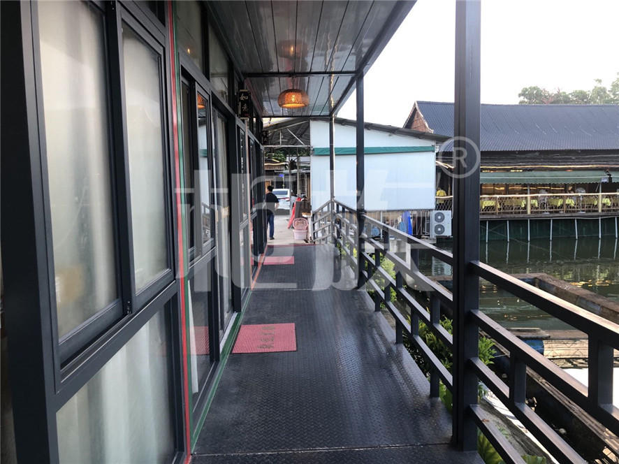 產(chǎn)品用材:鍍鋅方管框架、鋼化玻璃門(mén)窗、鋁花紋板走廊、生態(tài)木地板。